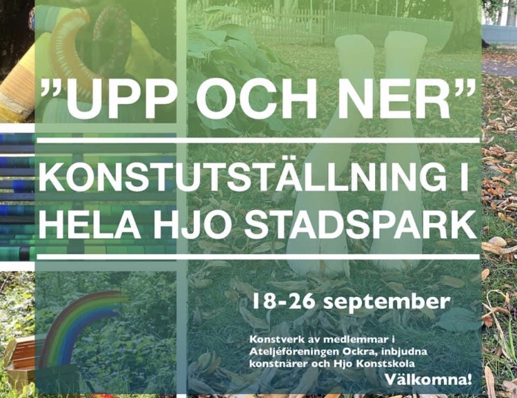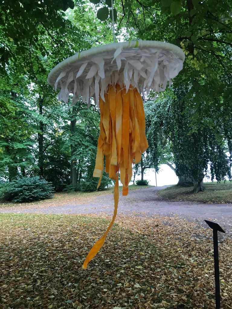 Konstutställning utomhus i Hjo’s vackra stadspark. Jag har med ett verk ”Ägget är löst”, textil skulptur.
